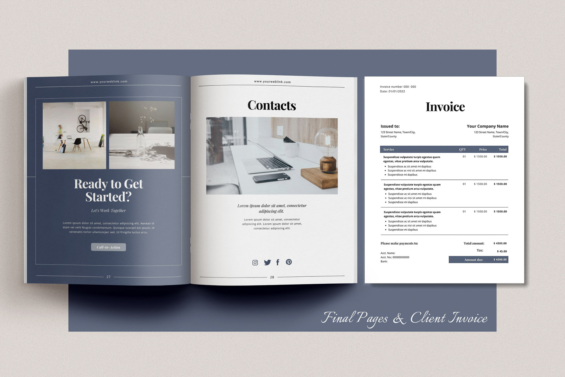 This template is ideal for creating client welcome packets, price lists, services & product guides, and project proposals.