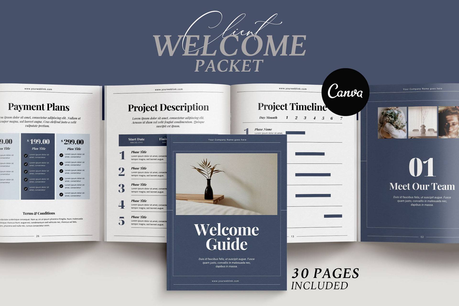 Client Welcome and Pricing Packet - 30 Pages in Canva Format, US Letter, and A4 Sizes